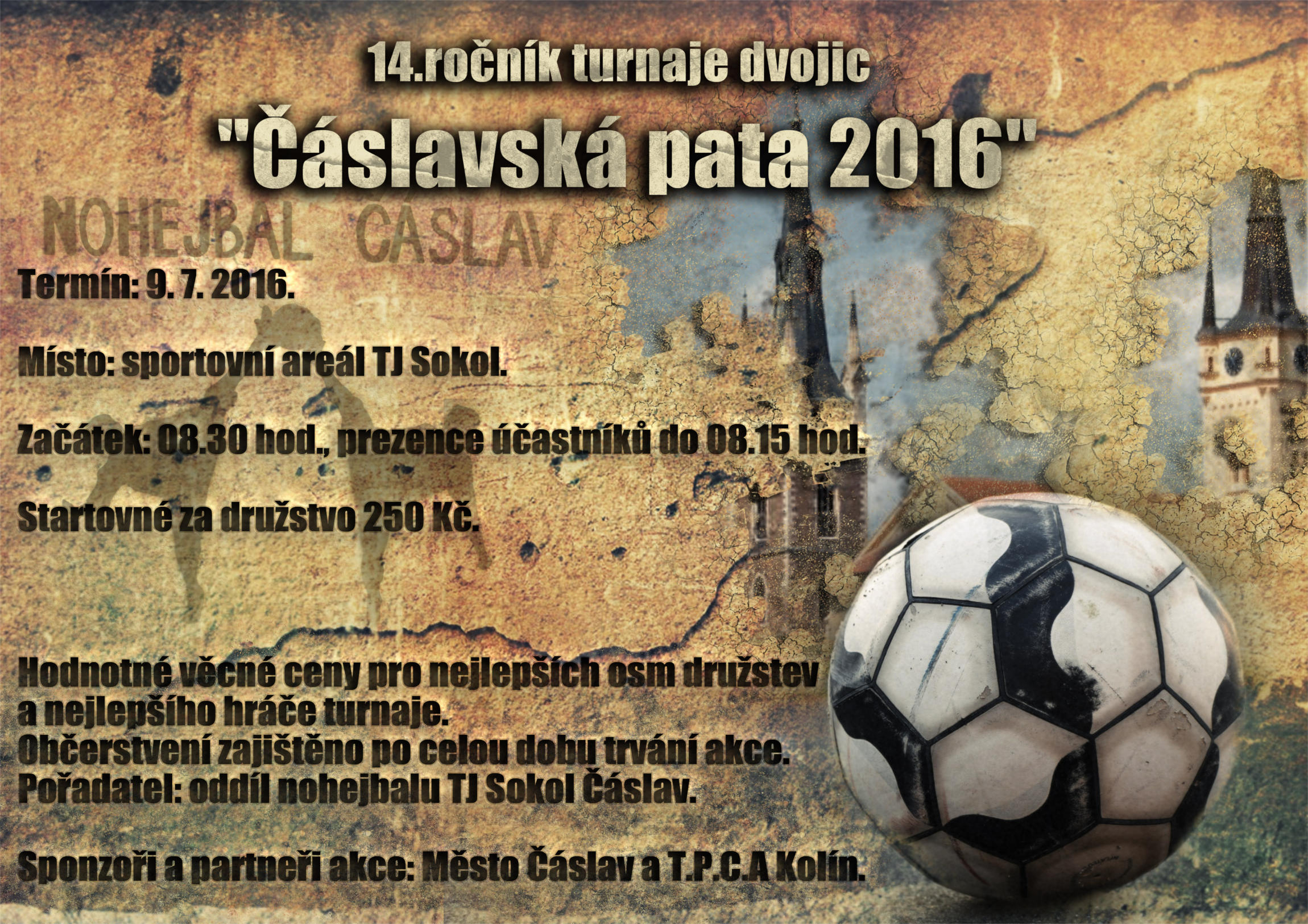 Popis: Oddíl nohejbalu TJ Sokol Čáslav Vás srdečně zve na v pořadí 15.ročník turnaje dvojic "Čáslavská pata 2017".